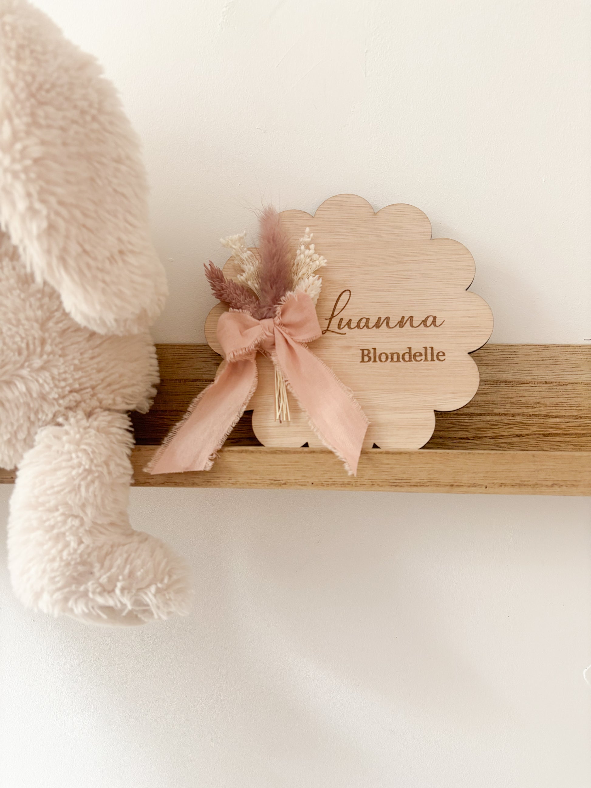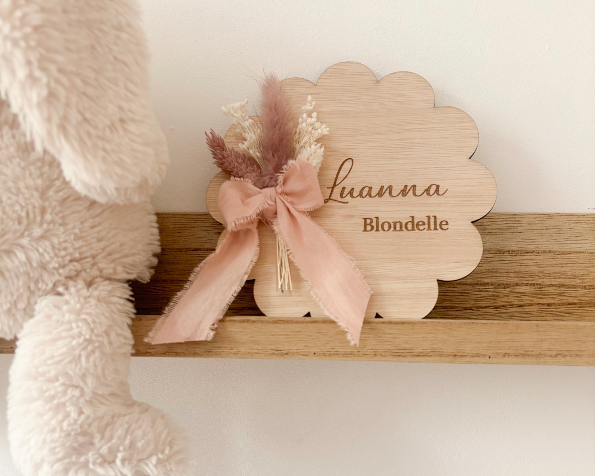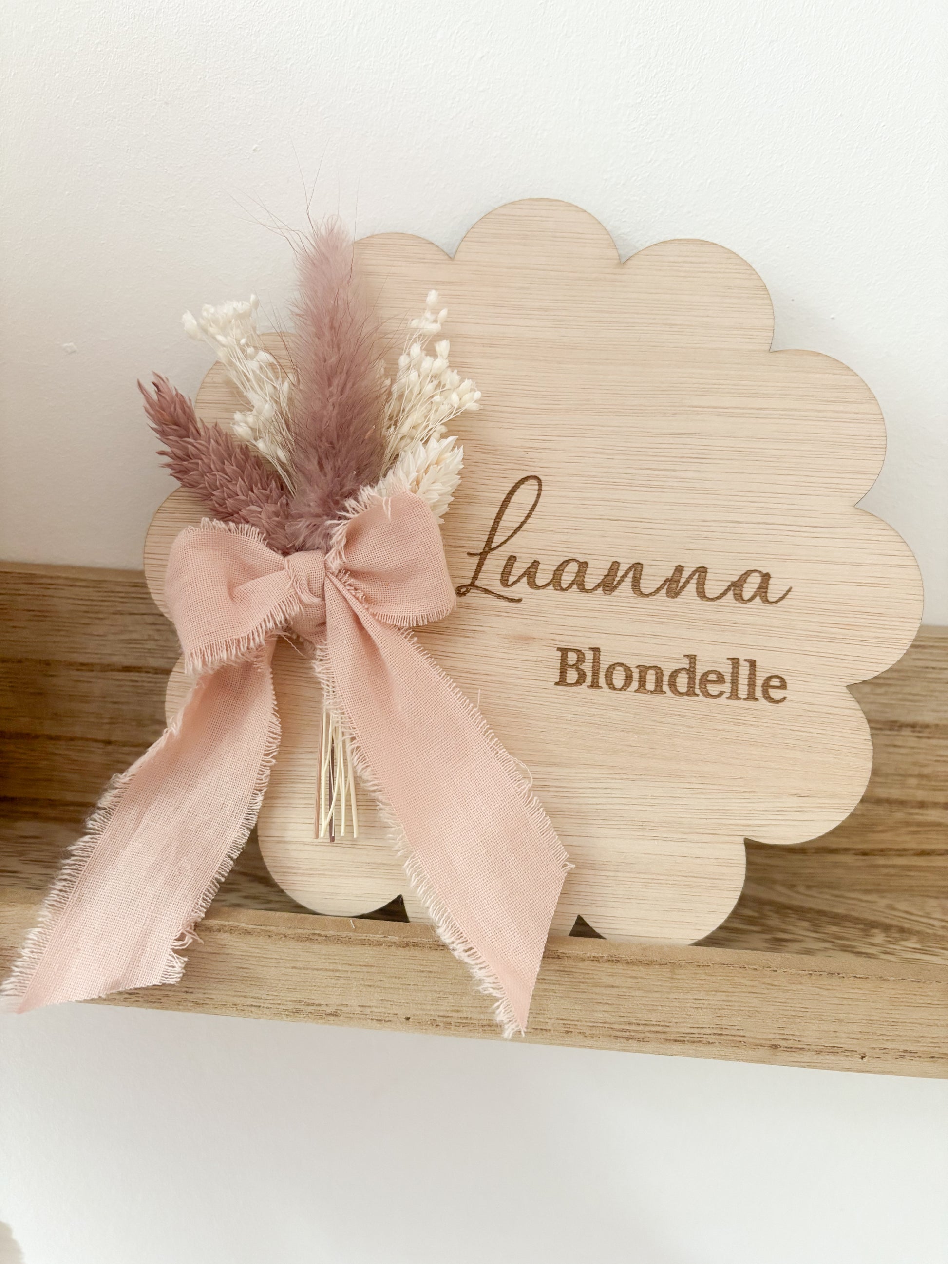 Kondig de geboorte van je kleintje aan met dit prachtige houten geboortebord in de vorm van een bloem met naam. Het bordje wordt gegraveerd met de naam en indien gewenst de 2e naam of achternaam. het bordje wordt indien gewenst afgewerkt met droogbloemen en een strik in kleur naar keuze.
