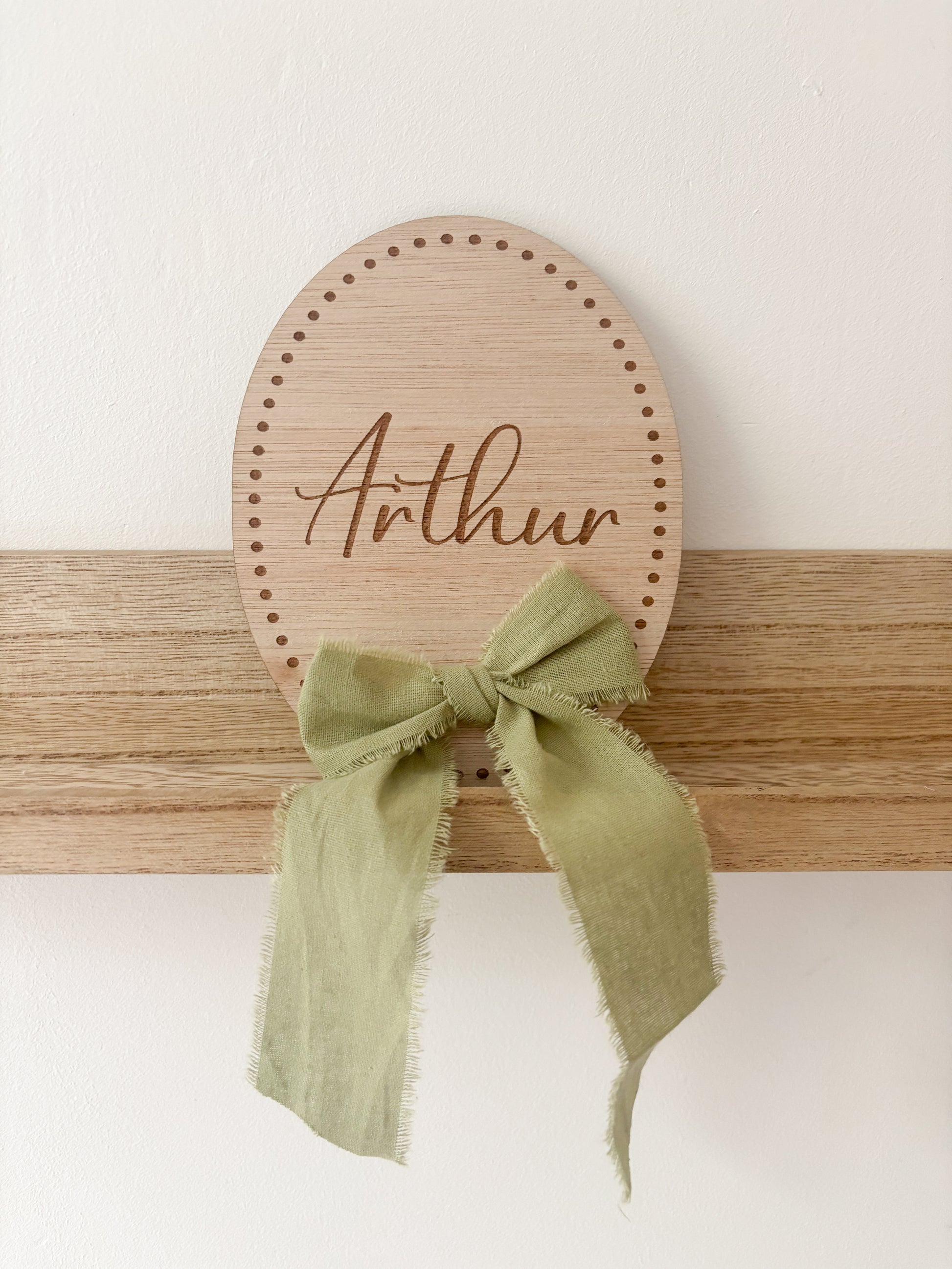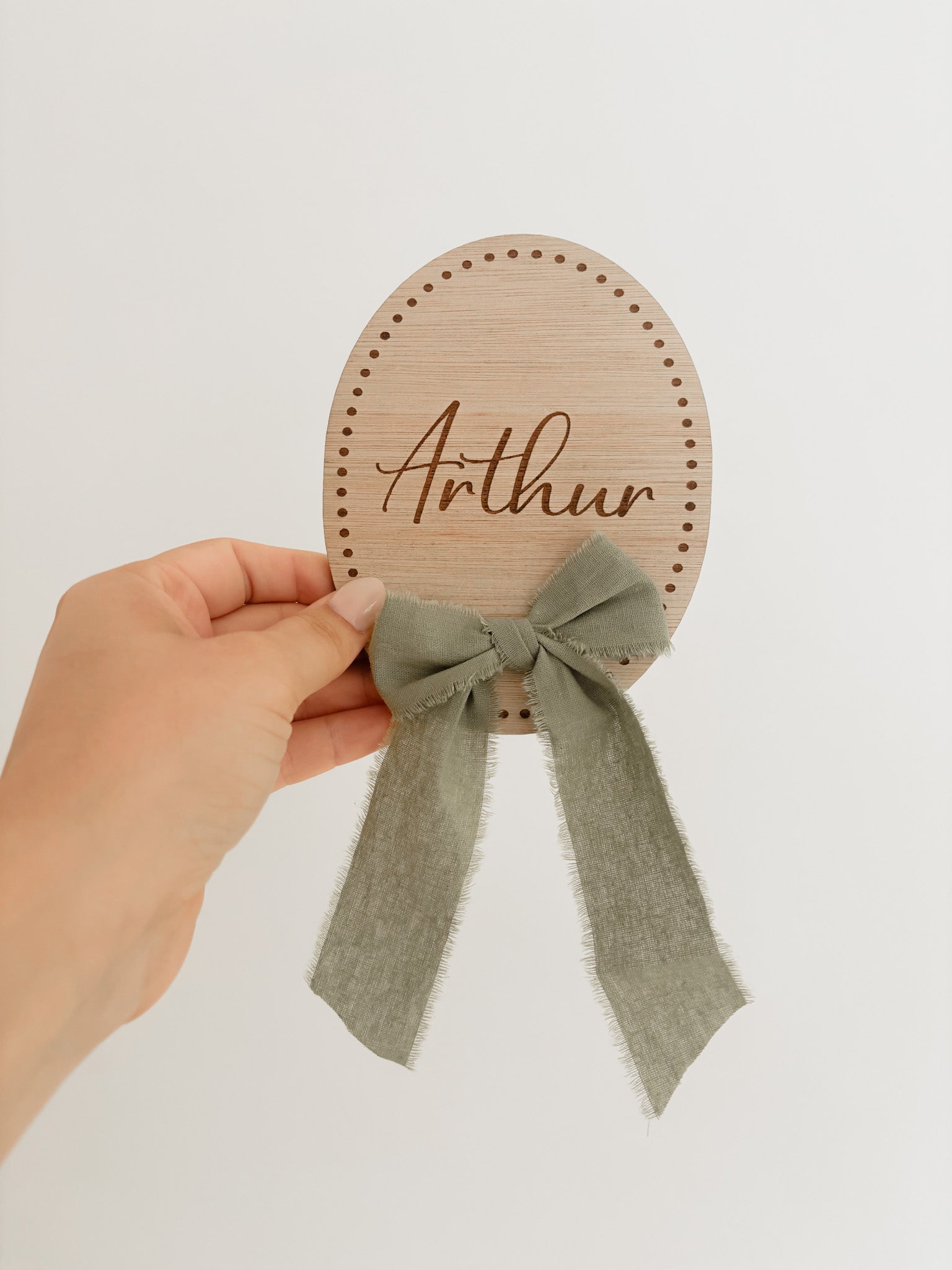 Kondig de geboorte van je kleintje aan met dit prachtige ovaal houten geboortebord met naam. Het bordje wordt gegraveerd met de naam en indien gewenst de 2e naam of achternaam. Mogelijk met of zonder strik.