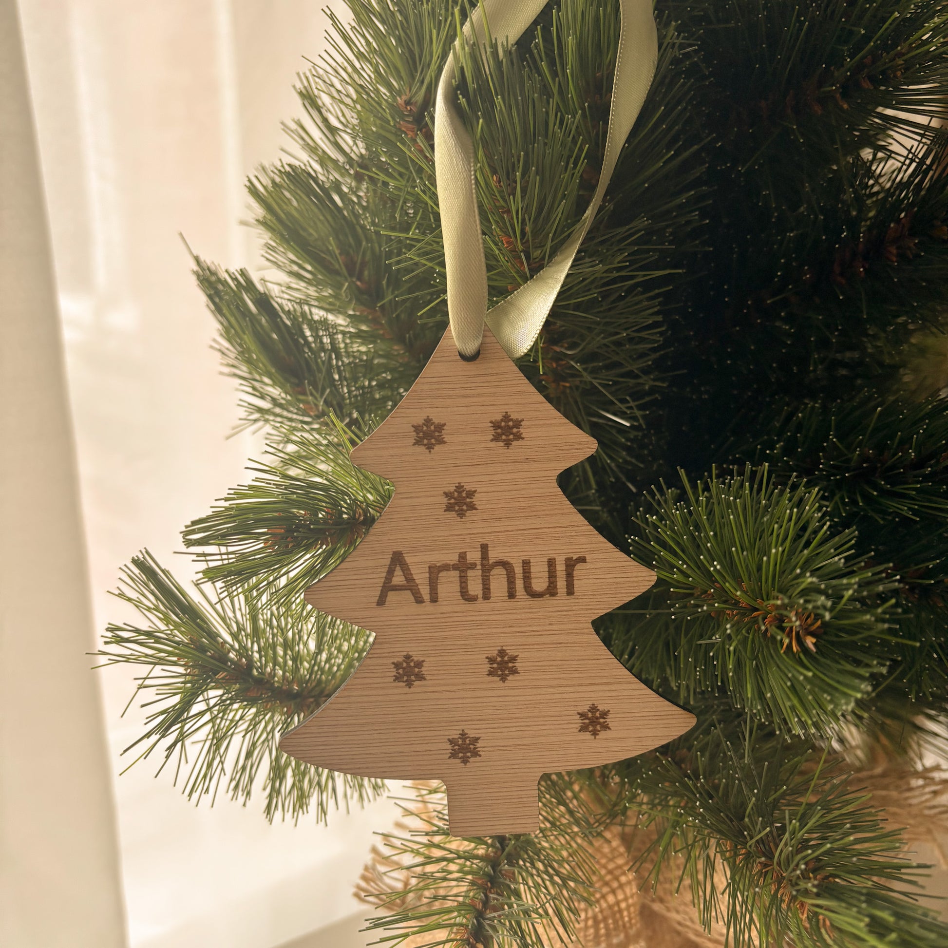 Kersthanger in de vorm van een kerstboom met sneeuwvlokjes en naam gegraveerd in hout, de kersthangers zijn 8cm breed