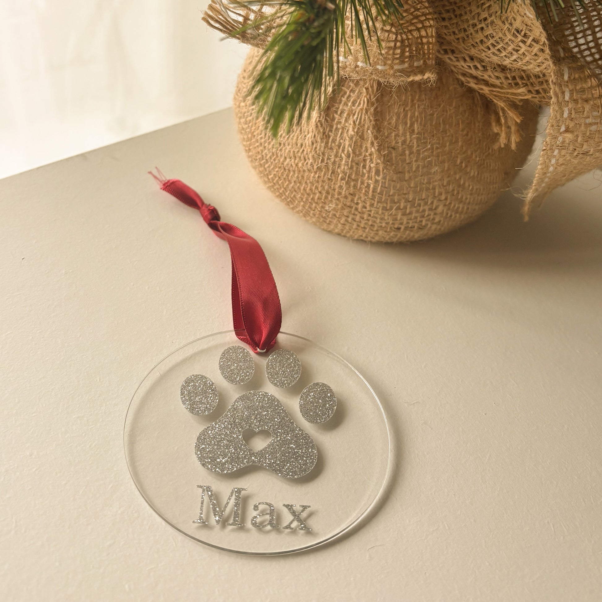Kersthanger in plexi bedrukt met hondenpootje en naam, diameter 9cm