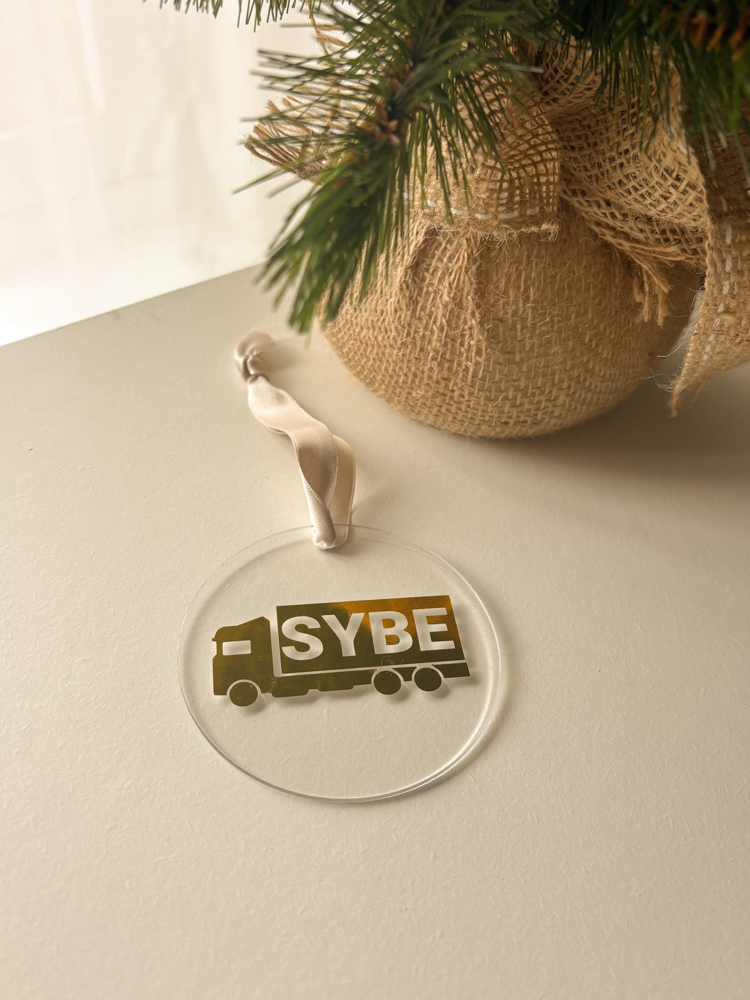 Kersthanger in plexi bedrukt met vrachtwagen en naam, diameter 9cm