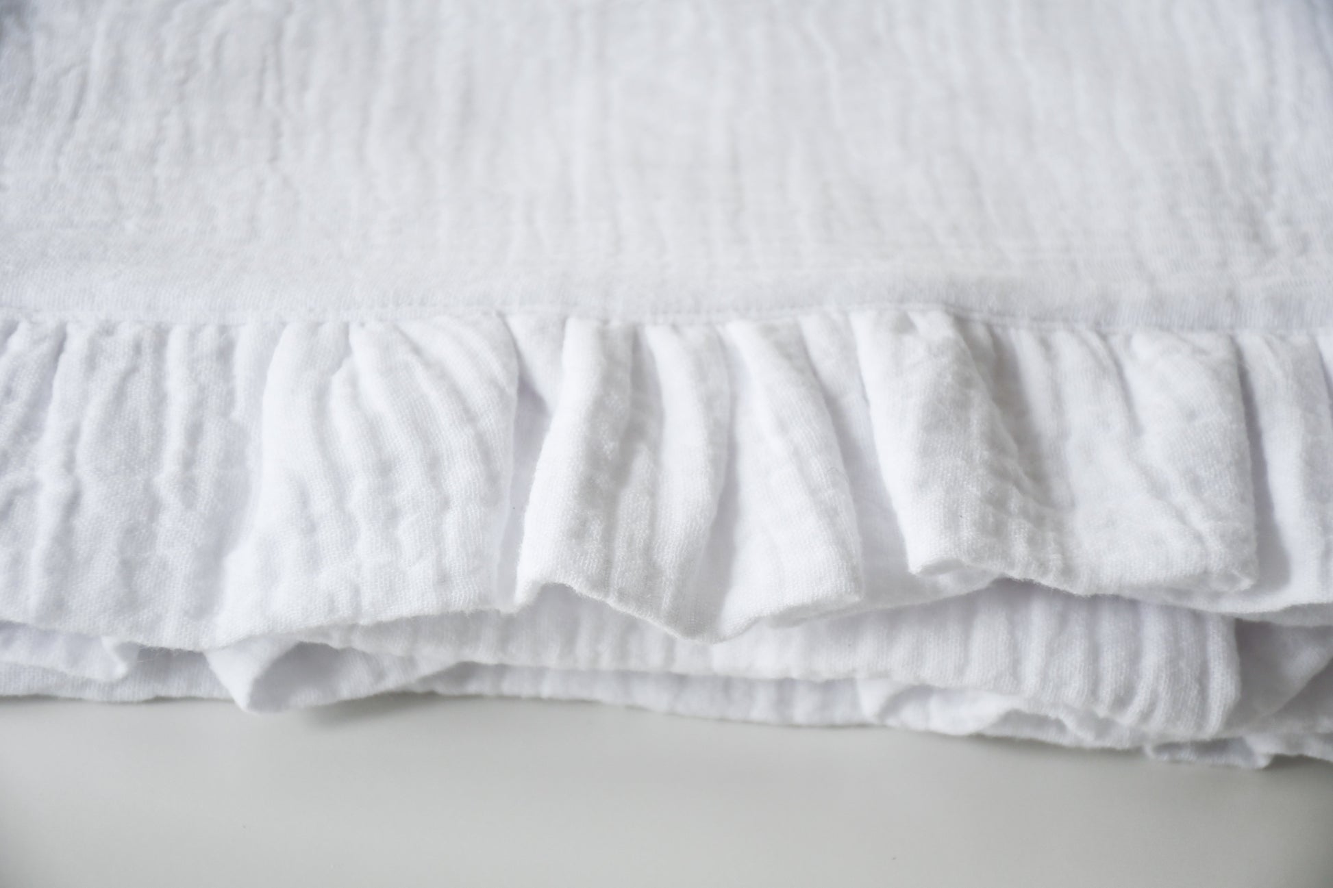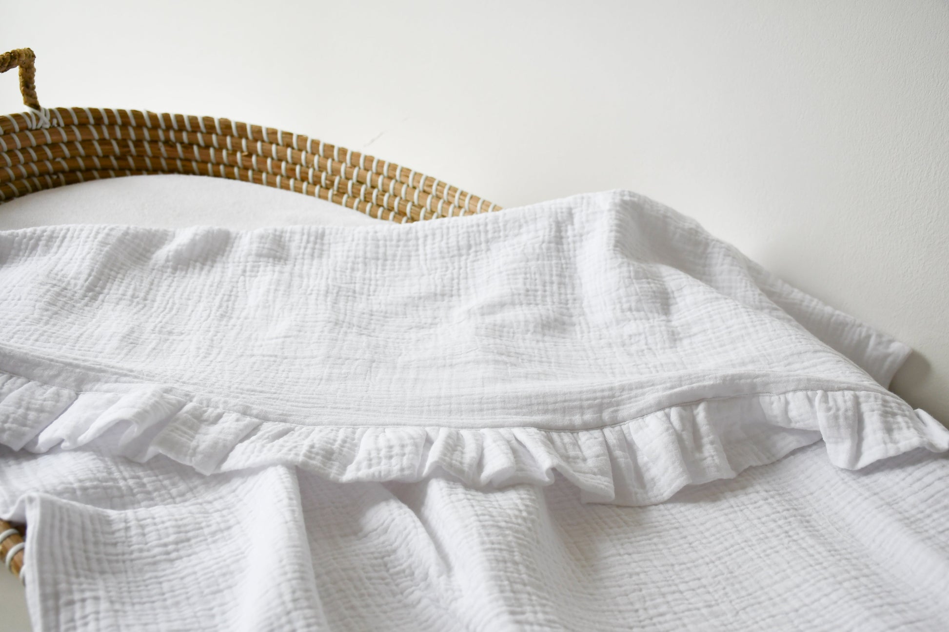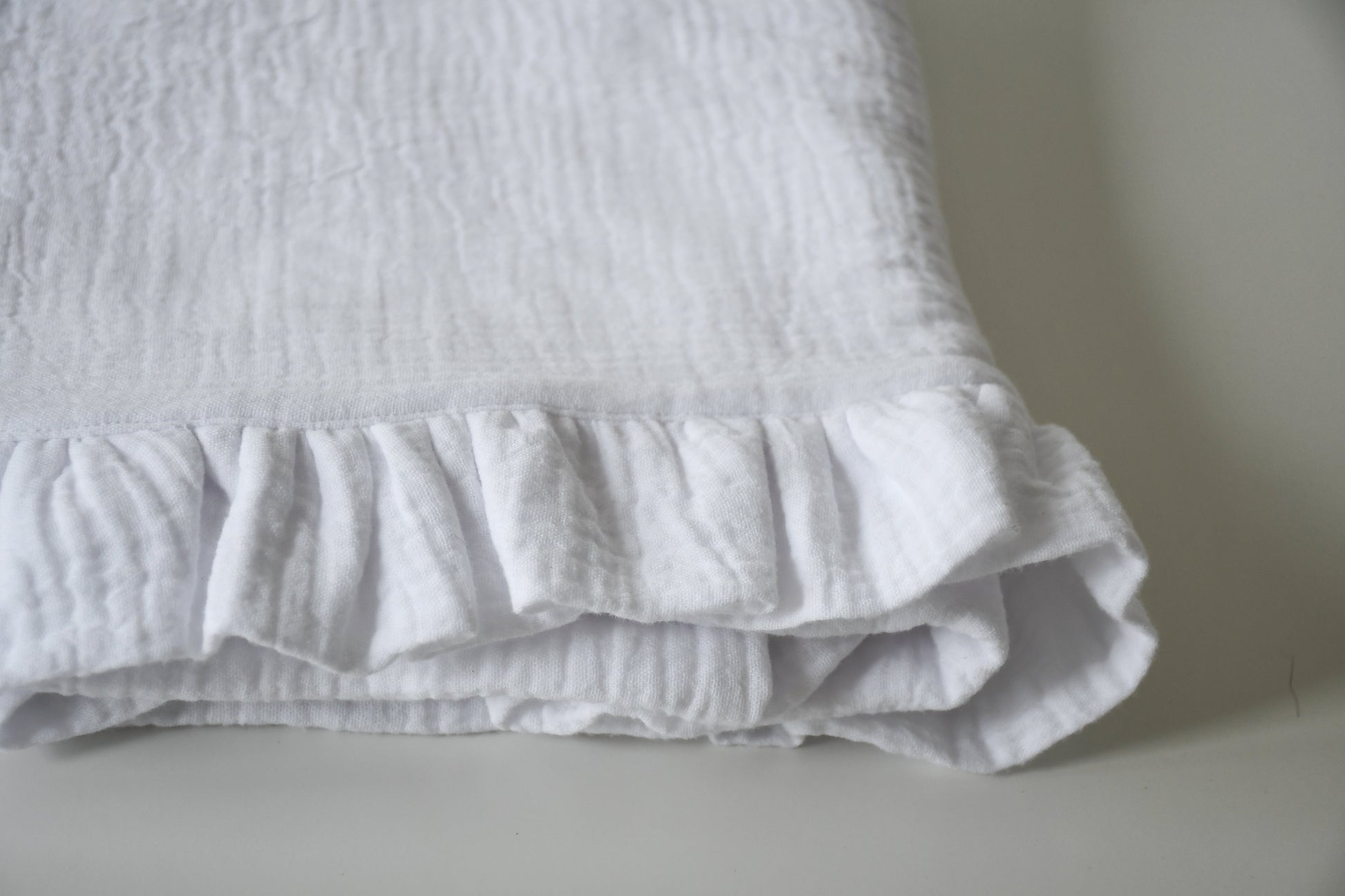 Hydrofiel laken met ruche langs 1 zijde. Je hebt de mogelijkheid om de naam op de omslag of onder de ruche te borduren.