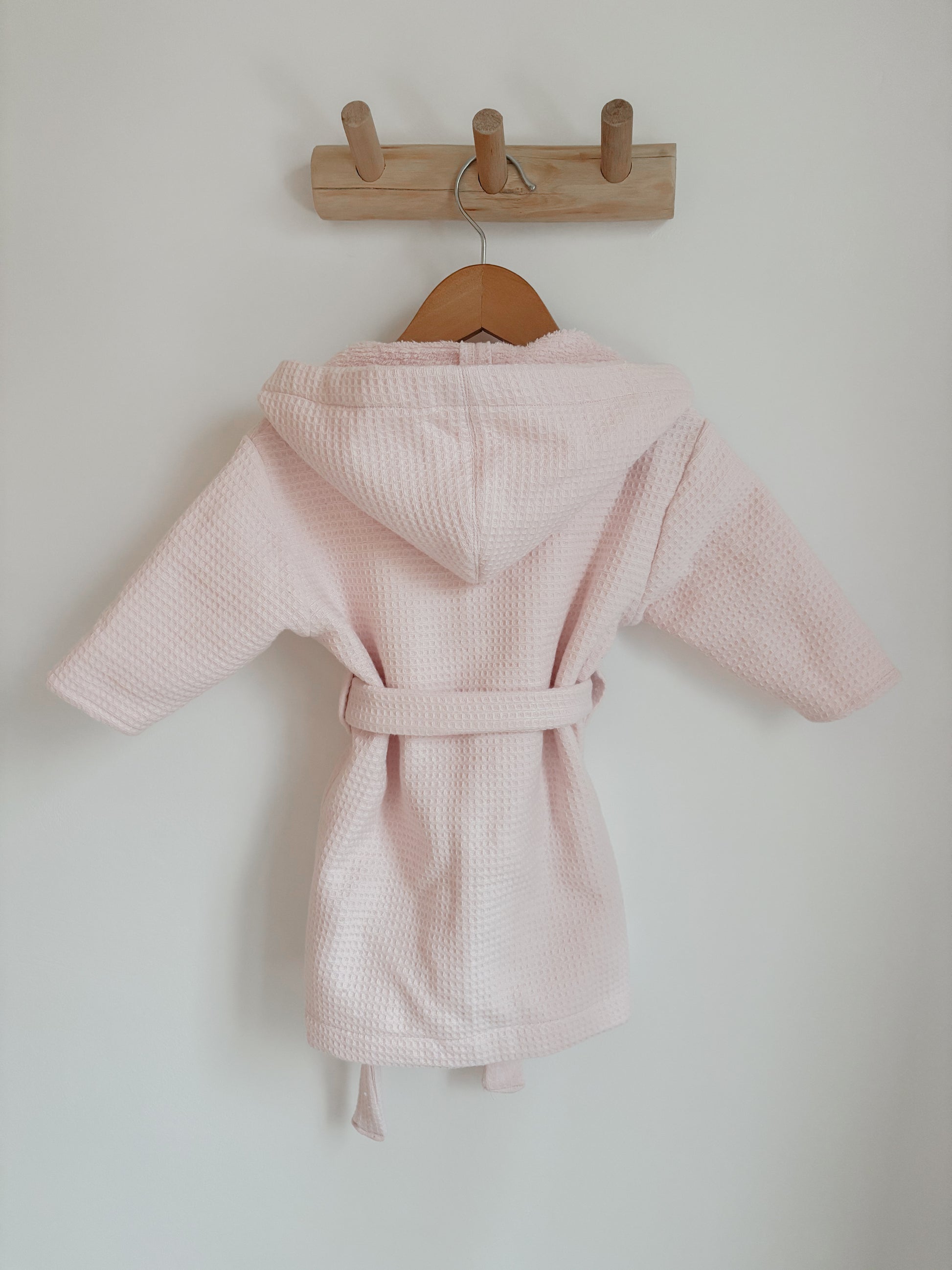 Deze handgemaakte badjas bestaat uit een wafel structuur aan de buitenzijde en badstof aan de binnenkant. Perfect om je kleintje warm en droog te houden na het bad.