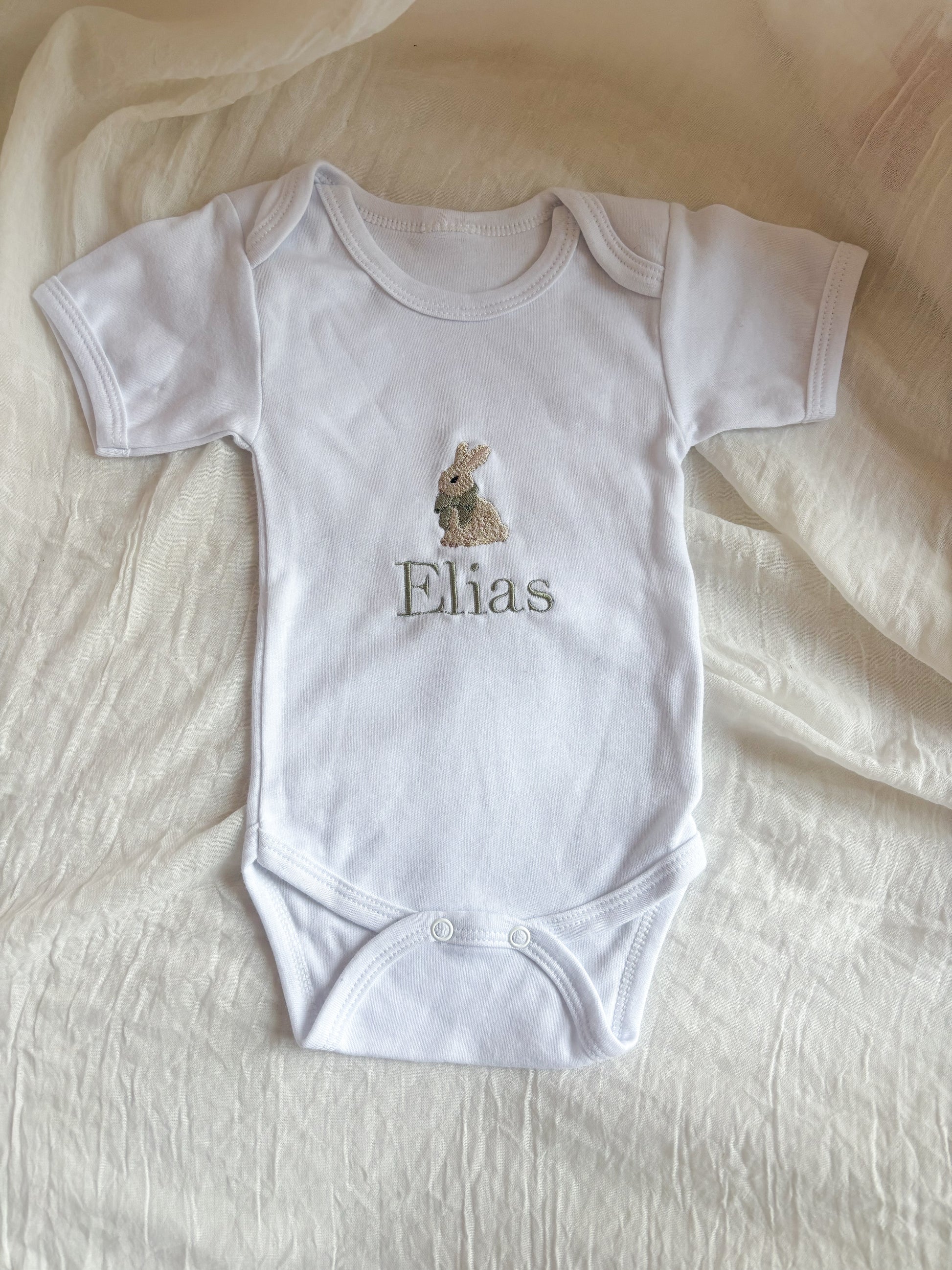 Hoe lief is dit! Een zachte romper met een schattig konijntje en de naam van jouw kleintje erop geborduurd.
