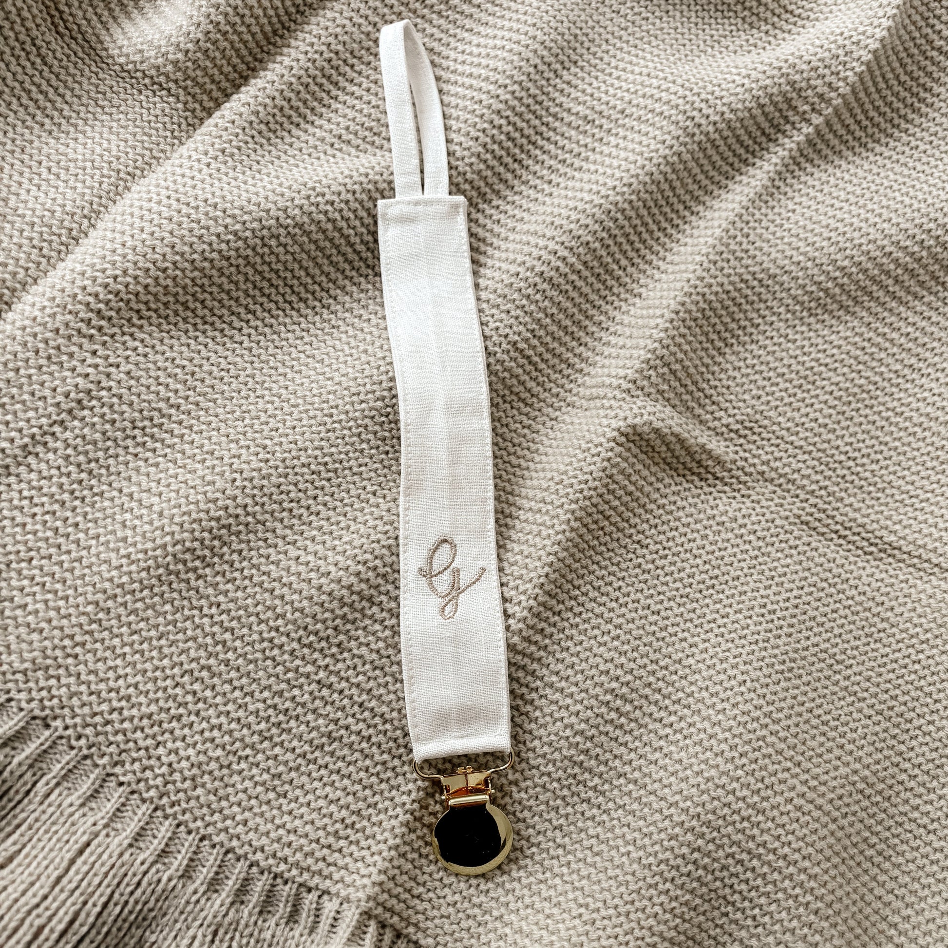 Handgemaakte speenkoord geborduurd met letter. De speenkoord wordt eerst geborduurd en daarna genaaid, hierdoor is de achterzijde van de speenkoord netjes afgewerkt en zijn er geen draden zichtbaar achteraan.