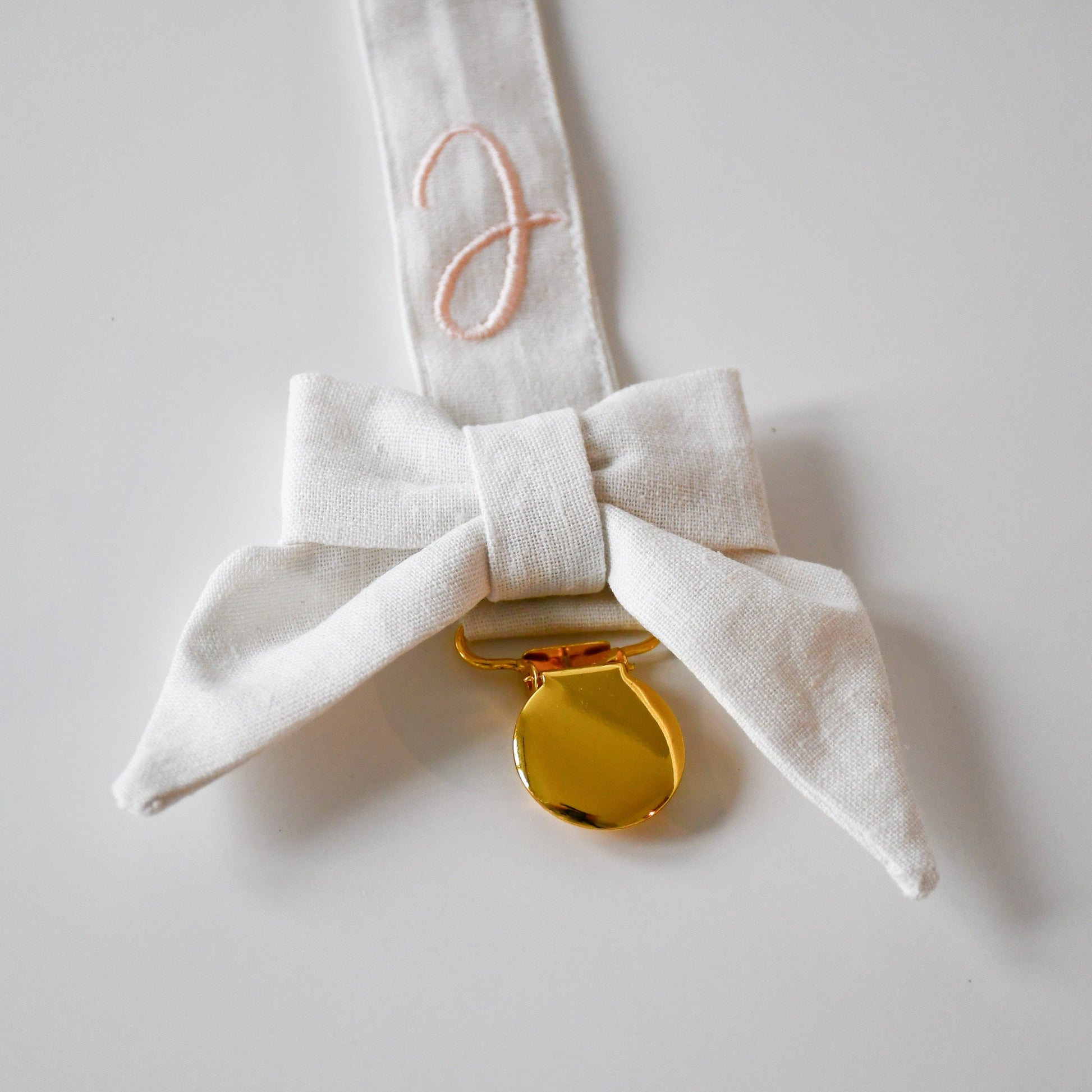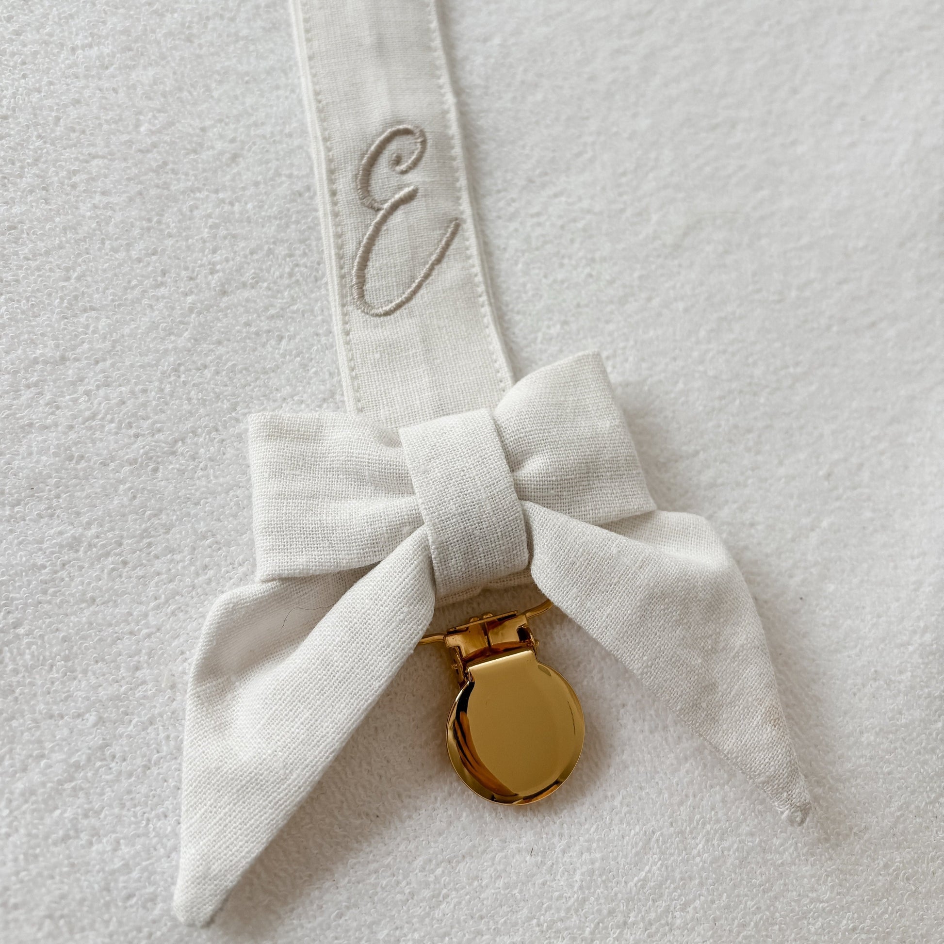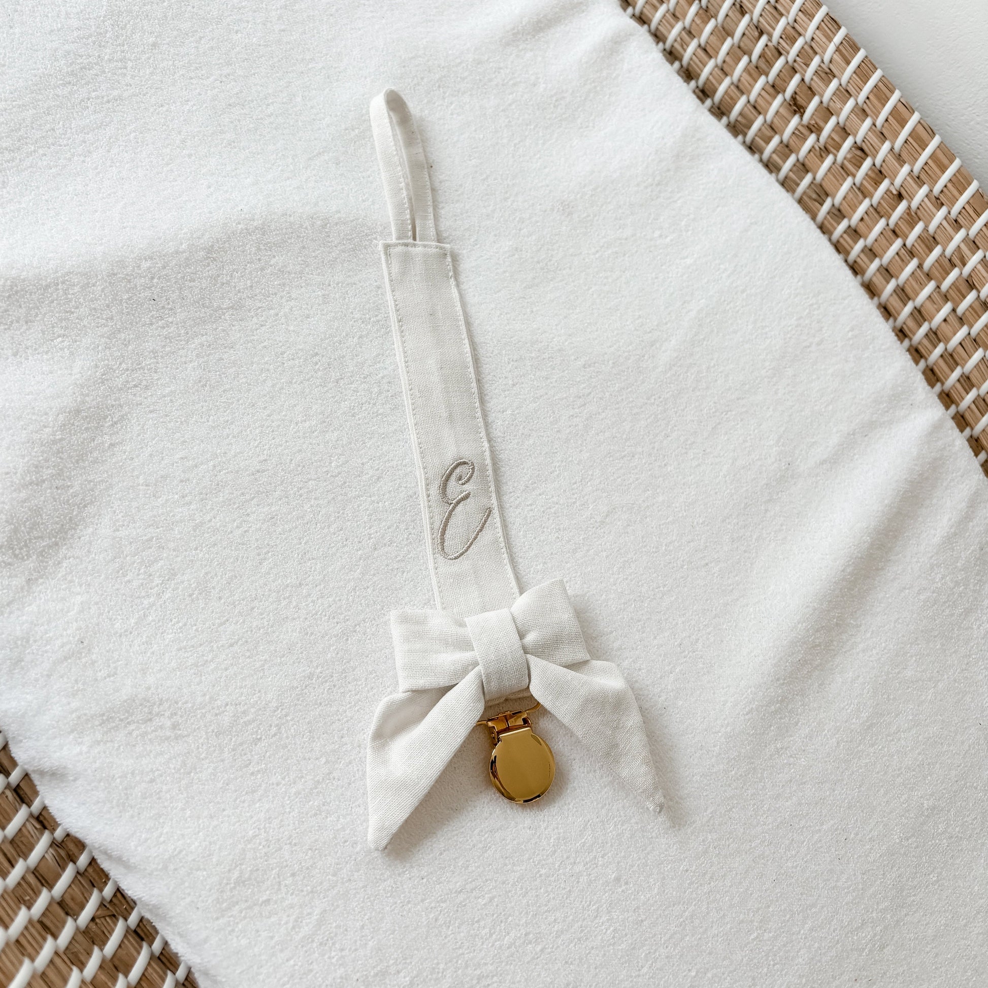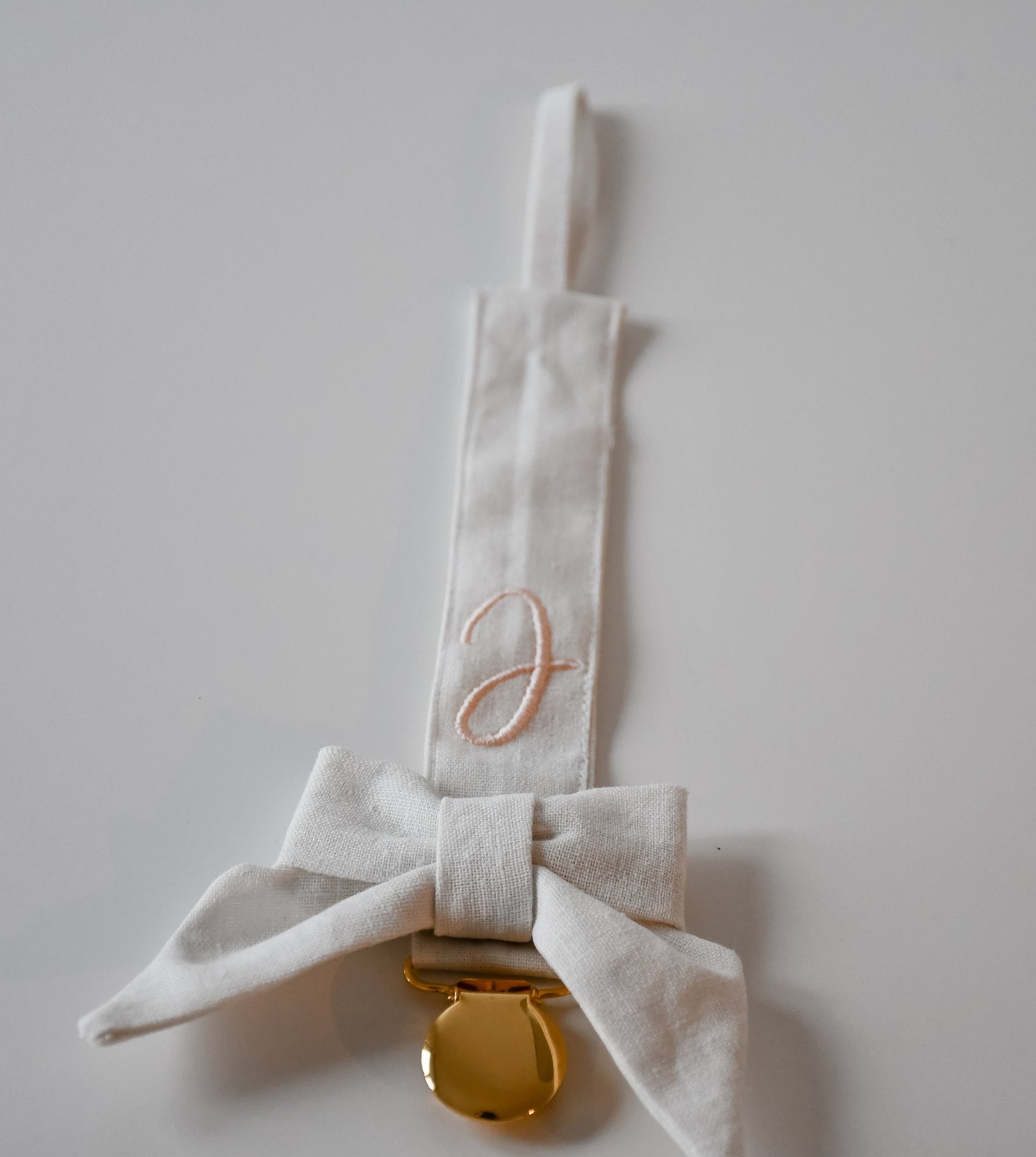 Handgemaakte speenkoord geborduurd met letter. De speenkoord wordt eerst geborduurd en daarna genaaid, hierdoor is de achterzijde van de speenkoord netjes afgewerkt en zijn er geen draden zichtbaar achteraan.