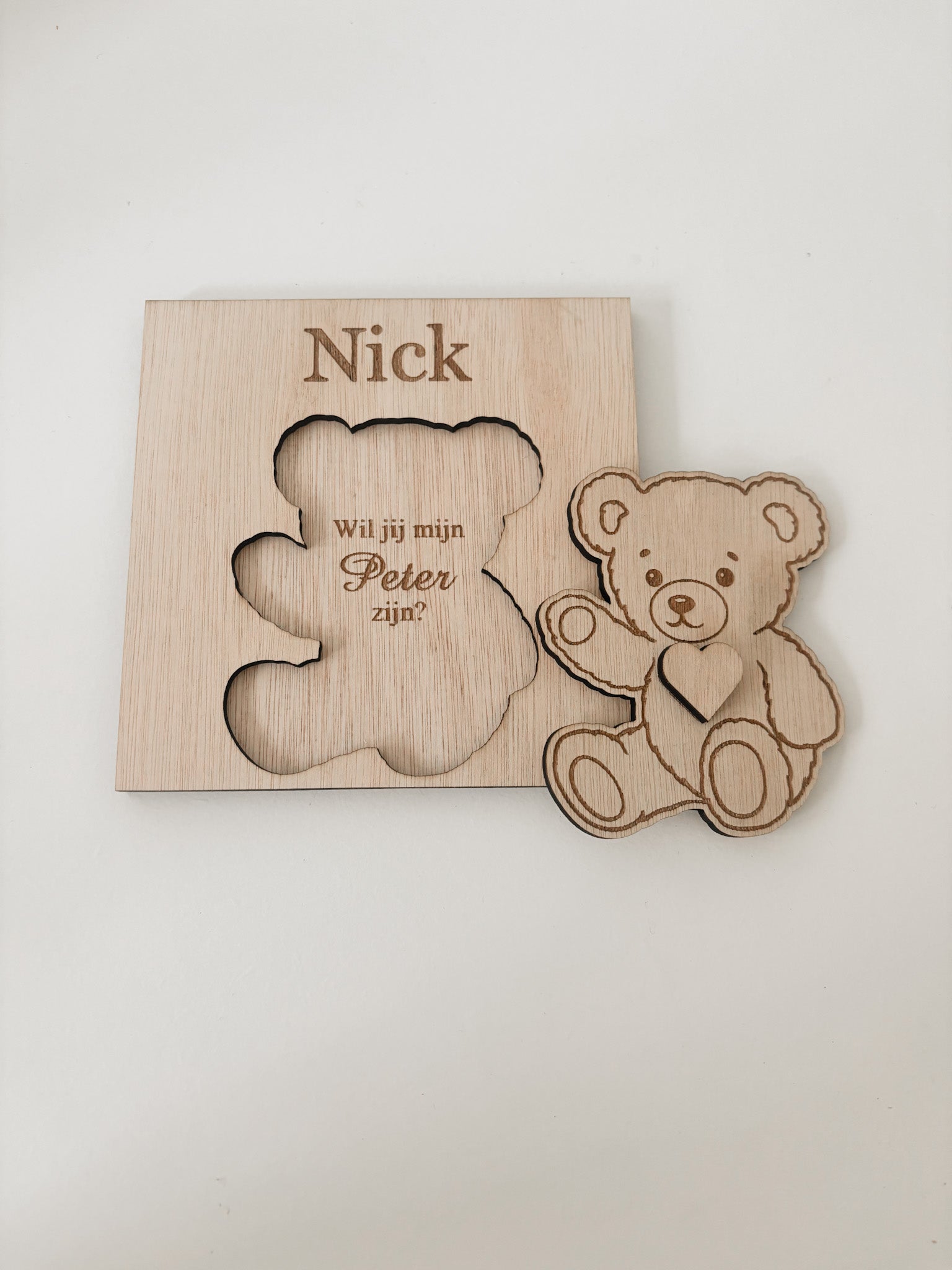 Maak een bijzonder moment nog specialer met deze originele houten kaart met verborgen boodschap. Achter het schattige houten beertje schuilt een persoonlijke vraag of boodschap, gegraveerd in hout : bijvoorbeeld “Wil jij mijn peter zijn?”, “Wil jij mijn meter zijn?” of “Wil jij mijn getuige zijn?”